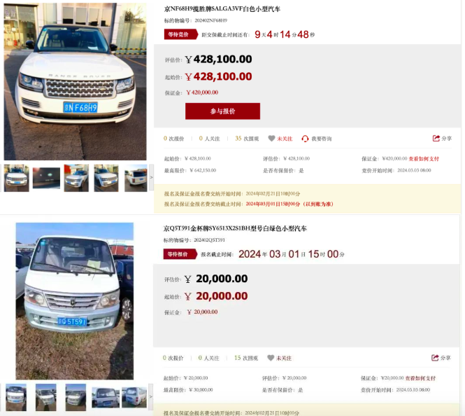 本次司法處置的小客車中,評估價最高的42.81萬元,是石景山法院處置的一輛2015年的攬勝牌汽車。評估價最低的2萬元,共有三輛,其中兩輛是豐臺法院處置的2009年的金杯汽車、2006年的帕薩特汽車,第三輛是昌平法院處置的2007年的長安牌汽車。