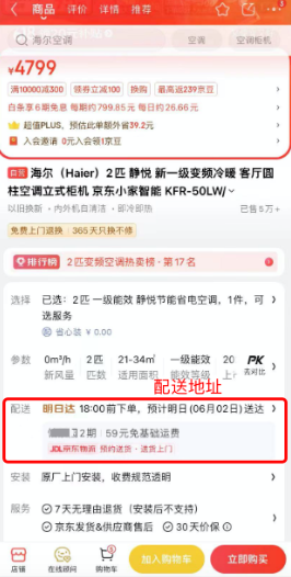 2、選擇商品并確認收貨地址。注意:在商品頁面下方配送地址需確認在北京市,否則不能享受優惠。