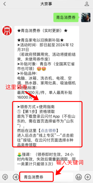 沒有云閃付App需先自行下載,已有云閃付的可直接在「大京事」公眾號回復“青島消費券”進入領券入口。