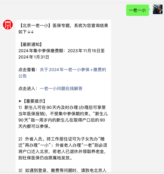 溫馨提示:關注【大京事】微信公眾平臺,可及時獲取最新北京市一老一小醫保繳費入口、報銷指南、定點醫院更改等政策及常見問題答疑。