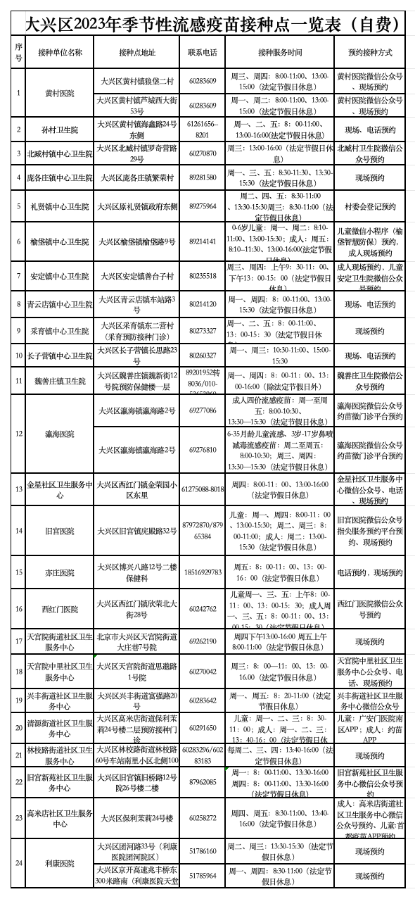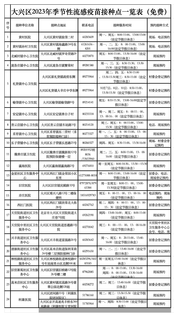 北京大興區流感疫苗接種門診服務時間公示來了,具體事宜可咨詢接種門診